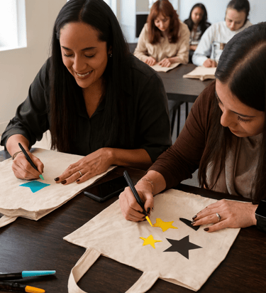 Esta actividad invita a los equipos a unirse para crear tote bags llenas de color, intención y significado, pensadas especialmente para mujeres que atraviesan situaciones vulnerables. A través del trabajo colaborativo, cada diseño se convierte en un mensaje de apoyo, cuidado y dignidad.