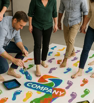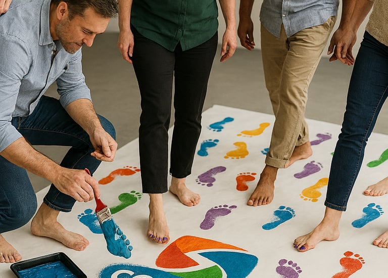 Los participantes crean un mural colectivo utilizando la pintura de una forma poco convencional, todos los miembros del equipo aportan su paso, dejando una marca única que da vida a un mural lleno de color.